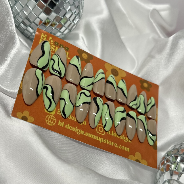 Adult Almond Green and Black Swirl Press-on Nails